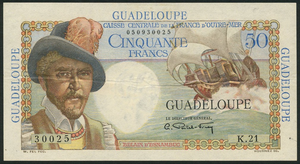Caisse Centrale de la France d'Outre-Mer, Guadeloupe, 50 francs, d'Esnambuc, ND (1946), prefix K.21, blue and multicoloured, Belain d'Esnambuc at left, galleon at right, GUADELOUPE in blue at top, left and right, Postel-Vinay signature, reverse multicoloured, Togolese maiden at left