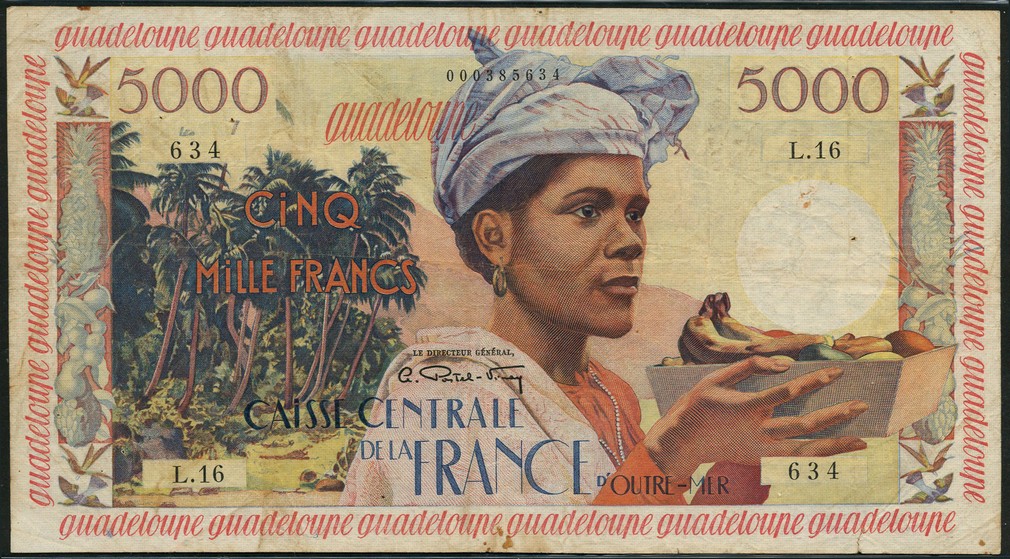 Caisse Centrale de la France d'Outre-Mer, Guadeloupe, 5000 francs, 'Antillaise', ND (type of 1955), serial number L.16-634, multicoloured, woman with basket of fruit at centre, trees at left, fruit at right, 'guadeloupe' in red script in borders around, Postel-Vinay signature, reverse blue and multicoloured, sugarcane harvesting, 'guadeloupe' in red script in borders around