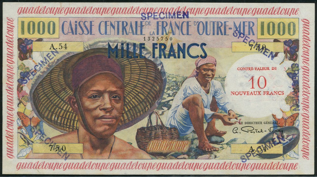 Caisse Centrale de la France d'Outre-Mer, Guadeloupe, specimen 10NF on 1000 francs on an issued example, 'Pecheur', ND (type of 1960), serial numbers A.54-750, multicoloured, fisherman at left in hat, fisherman at right preparing fish, 'guadeloupe' in red script in borders around, Postel-Vinay signature, red 'CONTRE VALEUR DE 10 NOUVEAUX FRANCS' overprint in right field, reverse blue and multicoloured, woman with tray of plantains and bananas, banana tree at right, 'guadeloupe' in red script in borders around