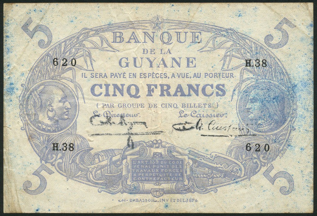 Banque de la Guyane, 5 francs, ND (1942), serial number H.38-620, blue and white, value at centre and at each corner, indigenous male and female head at left and right, Halleguen and Constantin signatures, reverse red and white, indigenous male head at centre, border of local flora and fauna