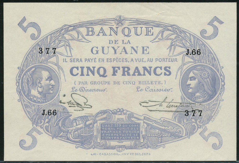 Banque de la Guyane, 5 francs, ND (1942), serial number J.66-377, blue and white, value at centre and at each corner, indigenous male and female head at left and right, Buy and Constantin signatures, reverse red and white, indigenous male head at centre, border of local flora and fauna