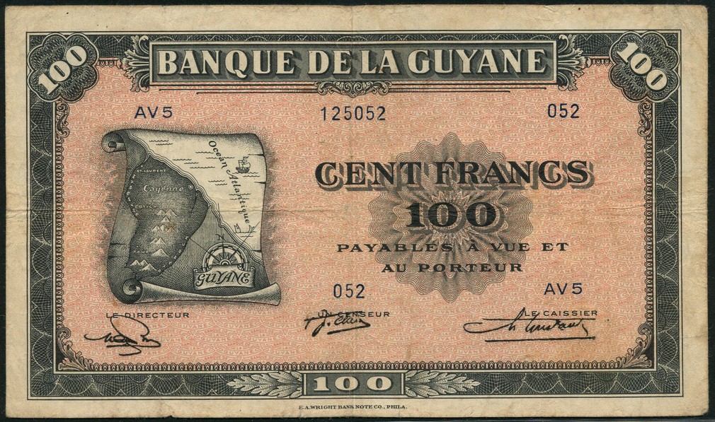 Banque de la Guyane, 100 francs, ND (1945), serial number AV5-052, pink and black, map of Guyane at left, signatures of Buy, Constantin and Saint-Clair, reverse green and pink, BG at centre, value at left and right