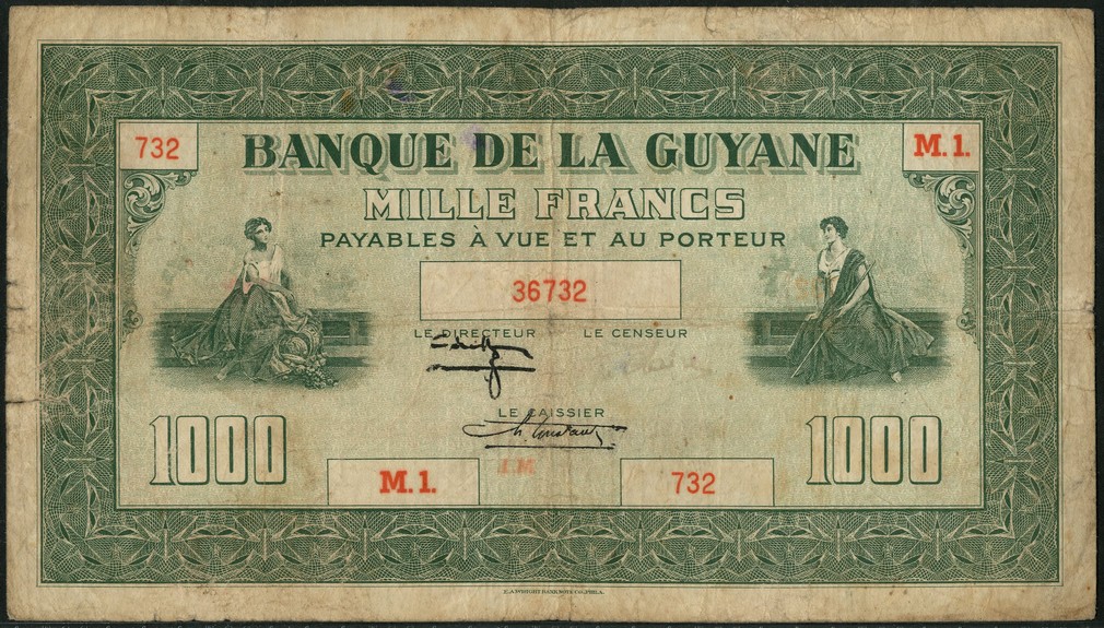 Banque de la Guyane, 1000 francs, ND (type of 1945), red serial number M.1 732, pale and dark green, allegorical maiden at left and right, printed signatures of Halleguen and Constantin and a manuscript signature of Saint Clair, value at centre and low left and right, reverse brown, head of Marianne at centre
