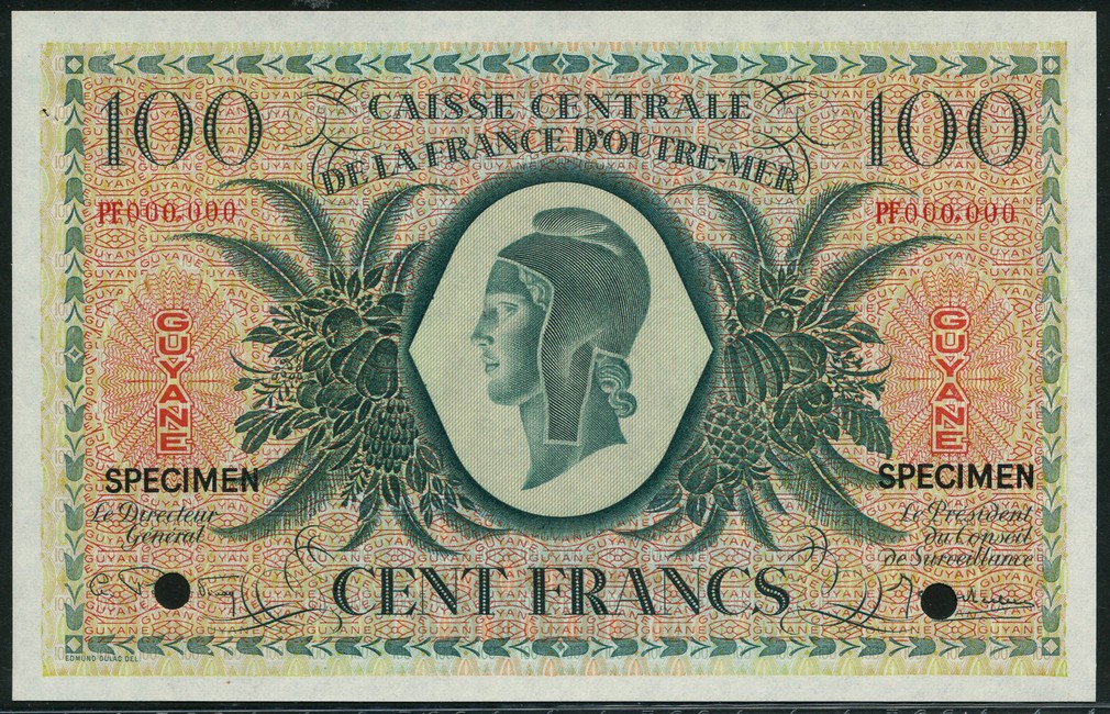 Caisse Centrale de la France d'Outre-Mer, Guyane, specimen 100 francs, ND (1946), red serial number PF 000000, green and pale red, head of Marianne at centre, exotic fruits and flowers to left and right, GUYANE in red at left and right, Postel-Vinay and Leclerc signatures, reverse green and pale orange, allegorical symbols of trade and commerce