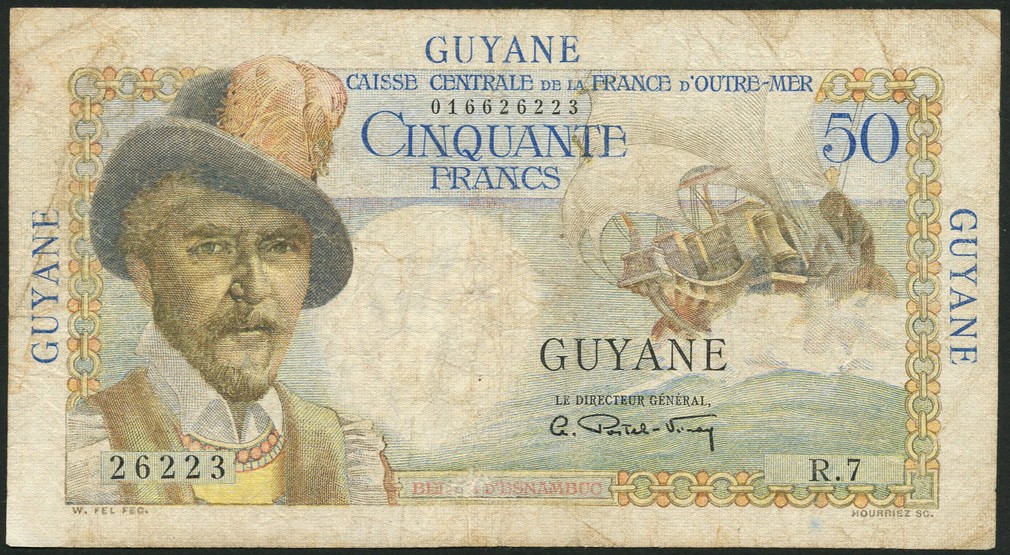 Caisse Centrale de la France d'Outre-Mer, Guyane, a group of the ND (1946) series comprising 5 francs, Bougainville, 10 francs, Colbert, 20 francs, Emile Gentil, 50 francs, Belain d'Esnambuc and 100 francs, La Bourdonnais, all Postel-Vinay signature