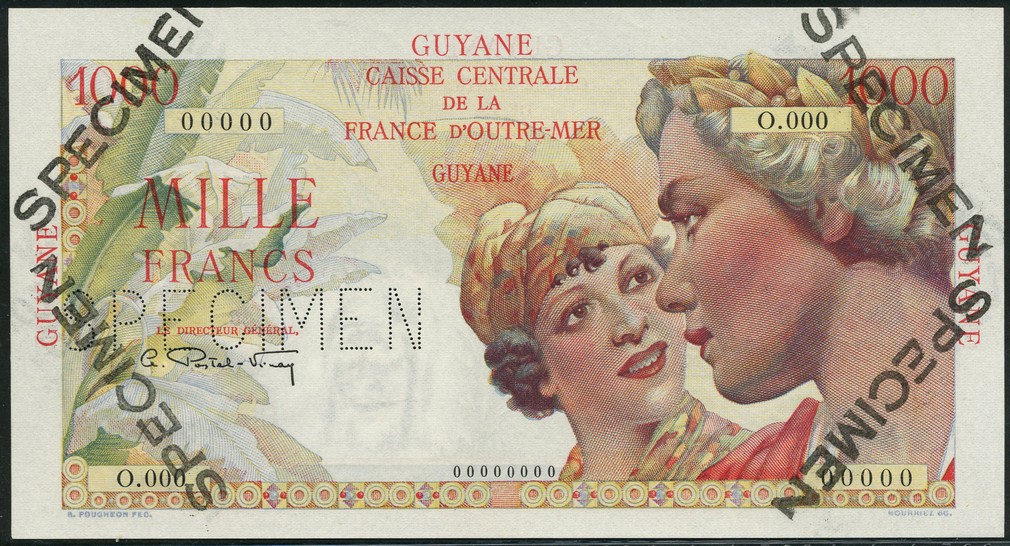 Caisse Centrale de la France d'Outre-Mer, Guyane, specimen 1000 francs, 'Union Francaise', ND (1946), zero serial numbers, red and multicoloured, allegorical vignette of the 'Union Francaise', two women representing France and a Martinican girl, GUYANE in red at top, left and right, Postel-Vinay signature, reverse multicoloured, canoe and woman