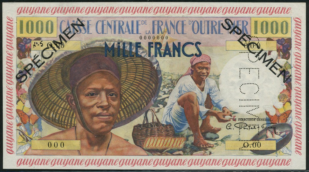 Caisse Centrale de la France d'Outre-Mer, Guyane, specimen 1000 francs, 'Pecheur', ND (1956), zero serial numbers, multicoloured, fisherman, 'Pecheur', at left, fisherman preparing fish at right, GUYANE in red ornate script in borders around, Postel-Vinay signature, reverse multicoloured, woman with basket of plantains and bananas balanced on her head