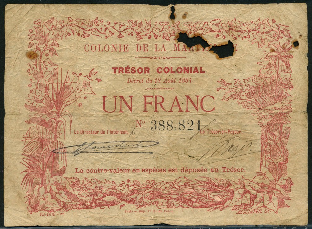Colonie de la Martinique, Tresor Colonial, 1 franc, Decree of 1884, serial number 388821, red and cream, value at centre, floral border around, two signatures below, reverse red and white, value at centre and at each corner, also a cheque on the Banque de la Martinique, unissued for 1 franc, 187-, lilac