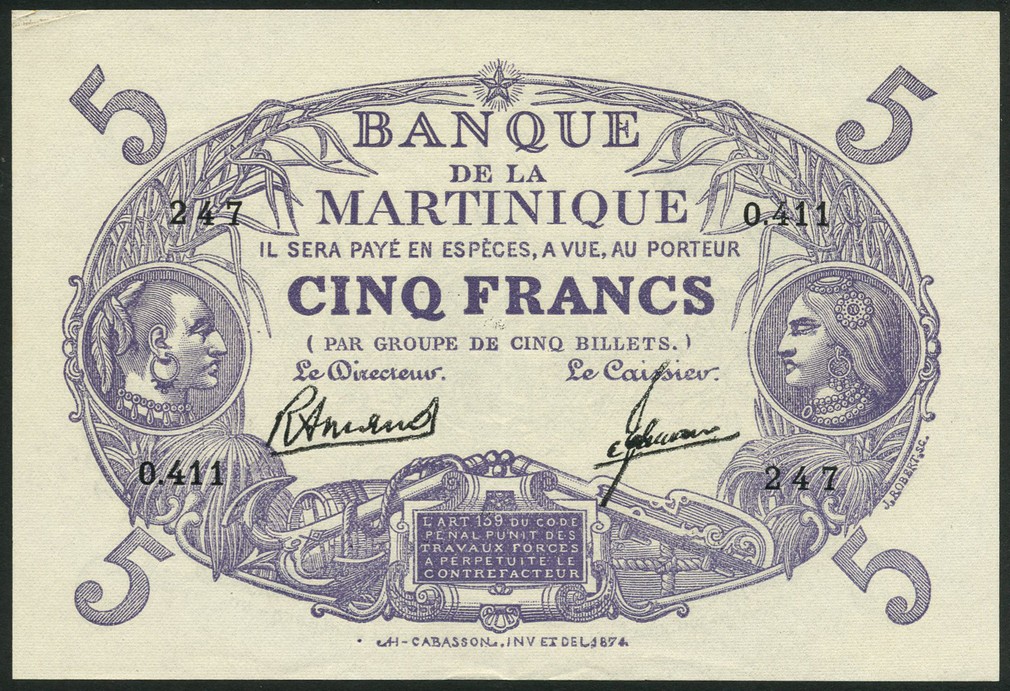 Banque de la Martinique, 5 francs, 'Cabasson', ND (1945), serial number O.411-247, mauve and white, value at centre and at each corner, indigenous male and female head at left and right, Arnaud and Rosemain signatures, reverse blue-green and white, indigenous male head at centre, border of local flora and fauna