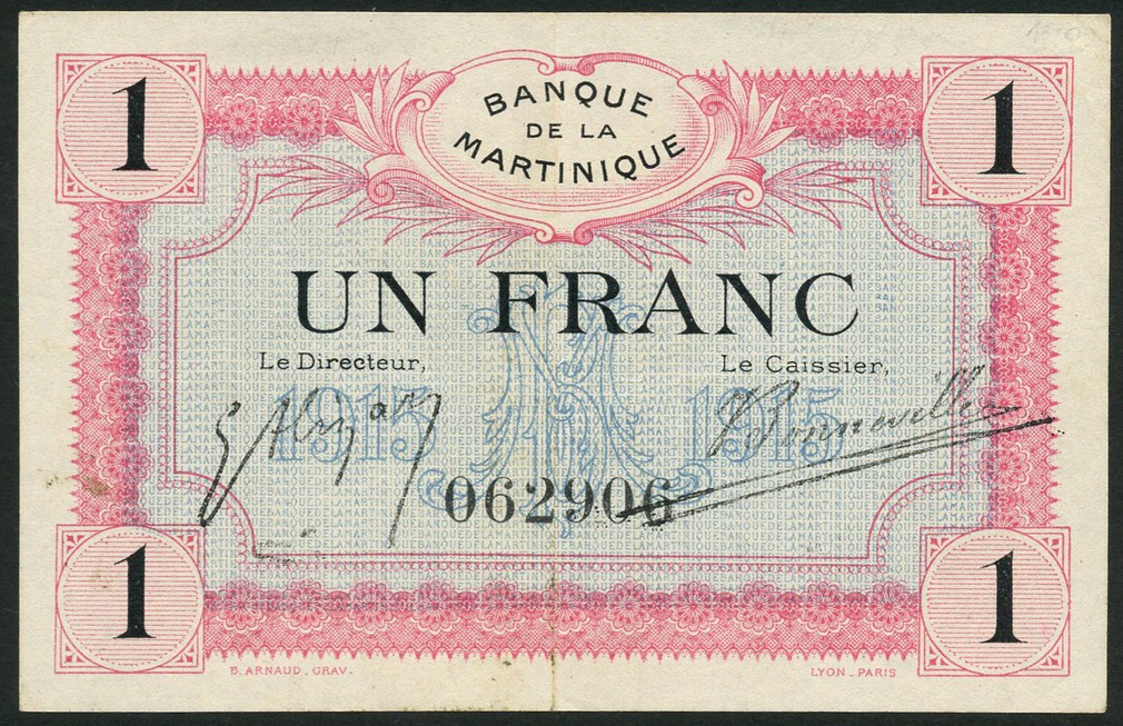 Banque de la Martinique, 1 franc, 'Billet de Neccessite', 1915, serial number 062906, pink and pale blue, value at centre and at each corner, Alizard and Bonneville signatures, reverse pink and pale blue, arms at centre, value at left and right