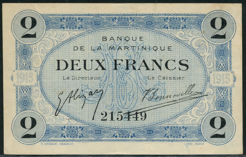 Banque de la Martinique, 2 francs, 'Billet de Neccessite', 1915, serial number 215449, pale blue and white, value at centre and at each corner, Alizard and Bonneville signatures, reverse pale blue, arms at centre, head of Marianne at centre, value at left and right