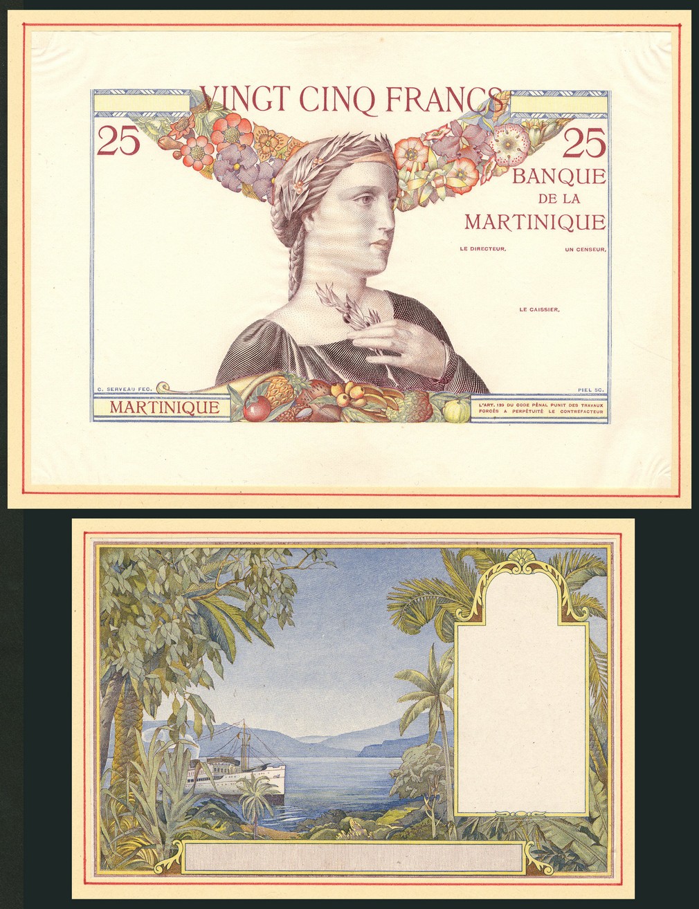 Banque de la Martinique, an obverse and reverse proof mounted on card for a 25 francs, ND (type of 1927), purple and multicoloured, woman laureate centre, fruit and flowers in field, reverse pale blue and green, ship and coastline