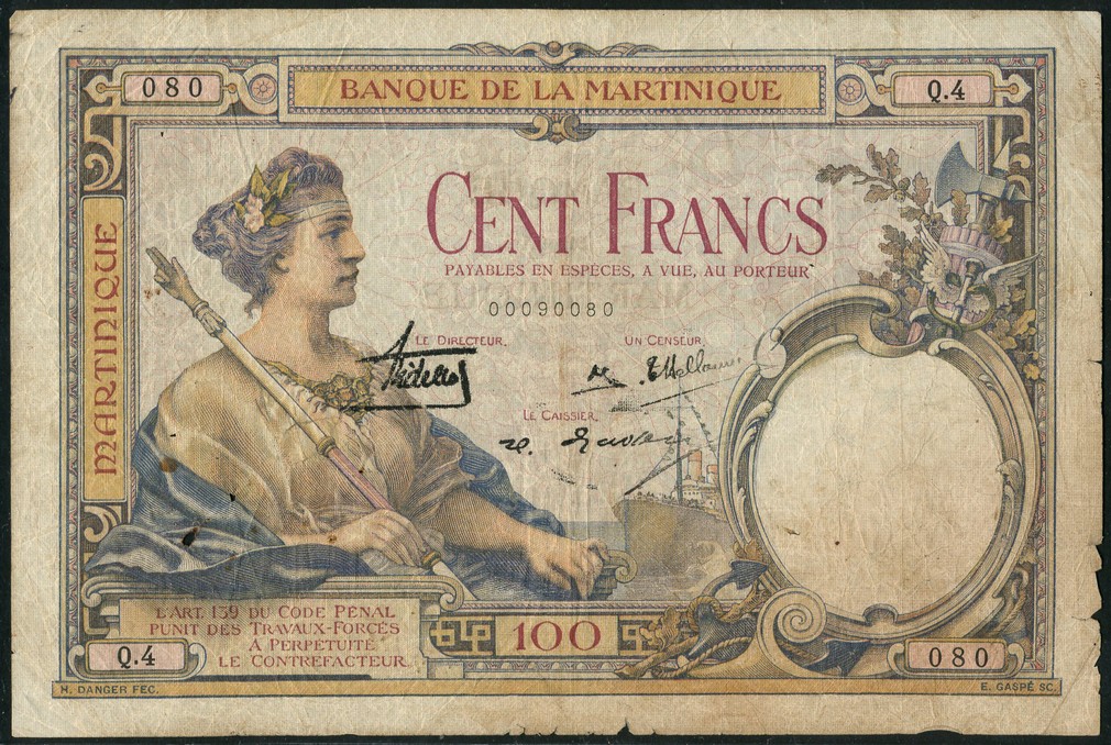 Banque de la Martinique, 100 francs, ND (1930), serial number Q.4-080, multicoloured, maiden representing the sea diademed at left and holding a sceptre, ship at centre, fasces at right, Didelot, Pradeu and Bellonie signatures, without value top left and right, reverse ship and coastline