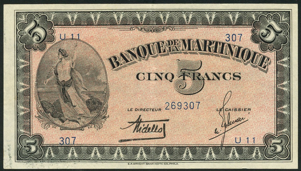 Banque de la Martinique, 5 francs 'type Americain', ND (1942), serial number U11-307, black on pink background, allegorical maiden (Liberty) in oval frame at left, value right centre and at each corner, Didelot and Rosemain signatures, reverse blue, head of indigenous woman at centre, value at left and right