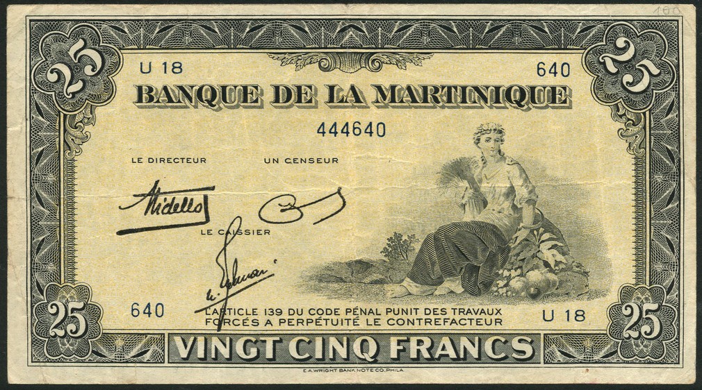 Banque de la Martinique, 25 francs 'type Americain', ND (1943), serial number U.18-640, yellow and black, seated maiden at right with scythe and corn sheaf (Agriculture), value low centre and at each corner, printed signatures of Didelot, Rosemain and Calvy, reverse green and white, ship and coastline in circular frame at centre, value at left and right