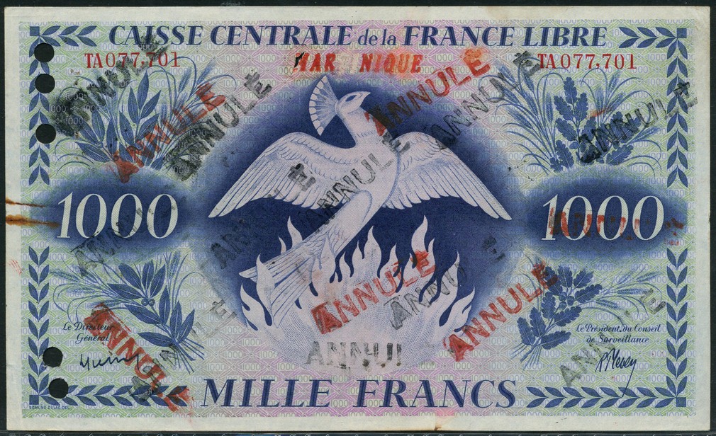 Caisse Centrale de la France Libre, Martinique, 1000 francs, 'Phoenix', ND (1946), red serial number TA 077701, blue and pale red, phoenix arising from flames at centre, value at left and right, MARTINIQUE handstamp in red top centre, Diethelm and Plevin signatures, reverse blue, allegorical scenes of war and peace at left and right