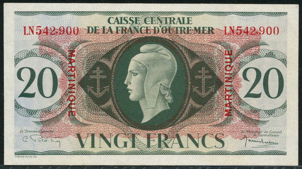 Caisse Centrale de la France d'Outre-Mer, Martinique, 20 francs 'type Anglais', ND (1946), serial number in red LN 542900, green, pale blue and red, head of Marianne at centre, MARTINIQUE in red at left and right, anchor conjoined with the cross of Lorraine at left and right, signatures of Postel-Vinay and Leclerc, reverse green and pale orange, penal code in oval at centre