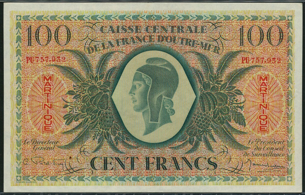 Caisse Centrale de la France d'Outre-Mer, Martinique, 100 francs, 'type Anglais', ND (1946), red serial number PU 757932, green and pale red, head of Marianne at centre, exotic fruits and flowers to left and right, MARTINIQUE in red at left and right, Postel-Vinay and Leclerc signatures, reverse green and pale orange, allegorical symbols of trade and commerce