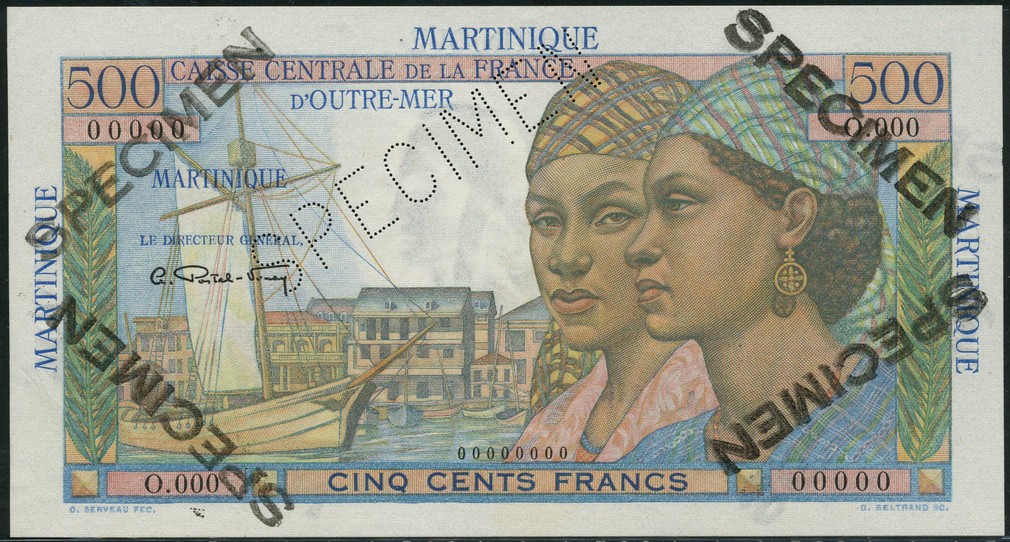 Caisse Centrale de la France d'Outre-Mer, Martinique, specimen 500 francs, 'Pointe a Pitre', ND (1947-), zero serial numbers, pale blue and multicoloured, two ladies at right, boat and harbour at left, Postel-Vinay signature, MARTINIQUE in blue in borders around, reverse multicoloured, two bullock carts with harvest