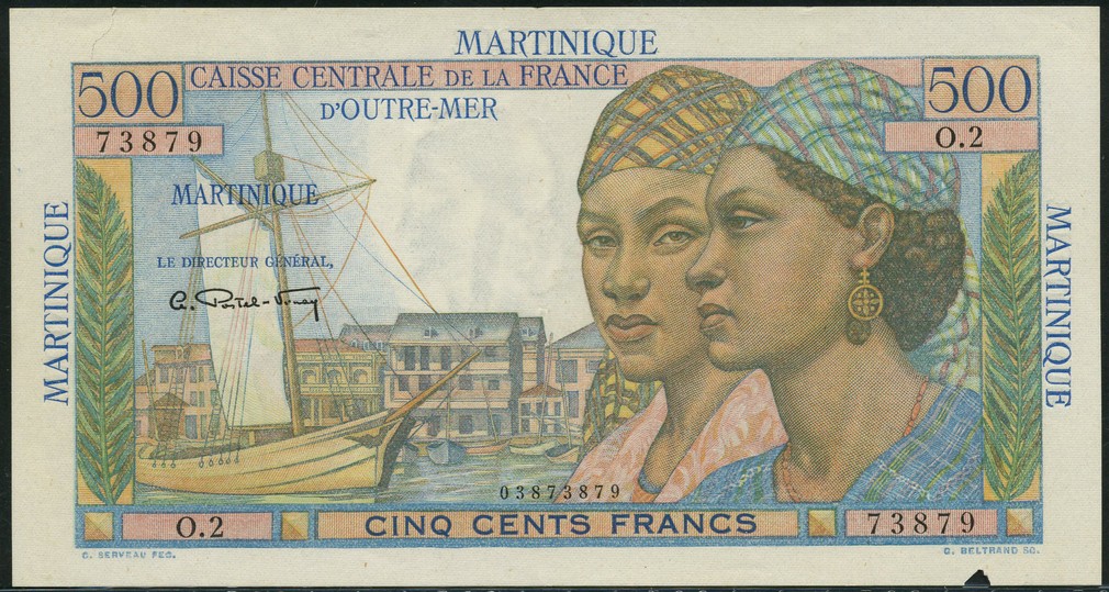 Caisse Centrale de la France d'Outre-Mer, Martinique, 500 francs, 'Pointe a Pitre', ND (1946-), serial number O.2 73879, pale blue and multicoloured, two ladies at right, boat and harbour at left, Postel-Vinay signature, MARTINIQUE in blue in borders around, reverse multicoloured, two bullock carts with harvest