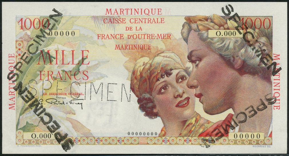 Caisse Centrale de la France d'Outre-Mer, Martinique, specimen 1000 francs, 'Union Francaise', ND (1946), zero serial numbers, red and multicoloured, women, France and a Martinican girl, at right, foliage in background, Postel-Vinay signature, MARTINIQUE in red in borders around, reverse multicoloured, coastline, locals in canoe and woman in head dress at right