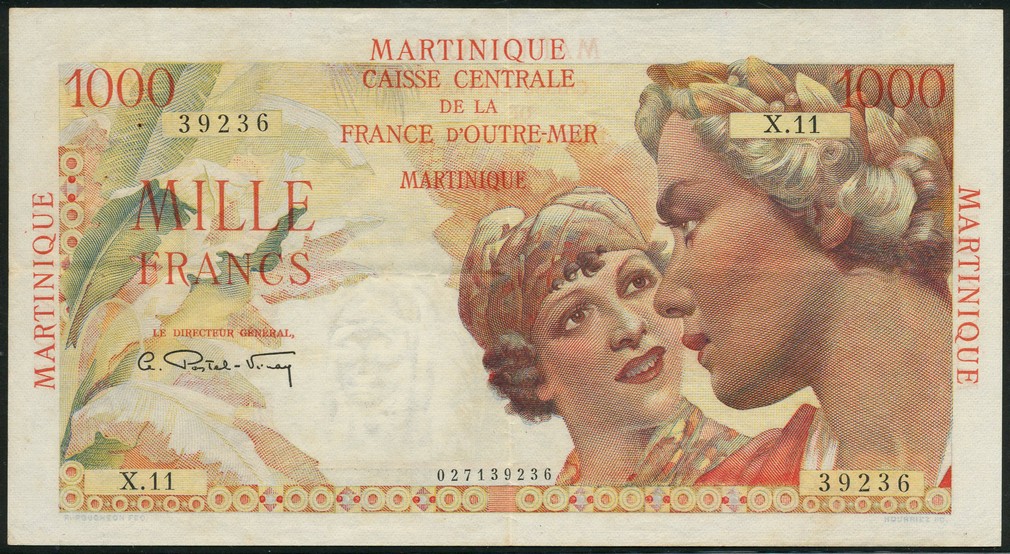 Caisse Centrale de la France d'Outre-Mer, Martinique, 1000 francs, 'Union Francaise', ND (1946), serial number X.11 39236, red and multicoloured, women, France and a Martinican girl, at right, foliage in background, Postel-Vinay signature, MARTINIQUE in red in borders around, reverse multicoloured, coastline, locals in canoe and woman in head dress at right