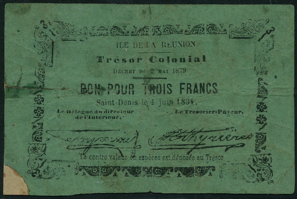 Tresor Colonial, Ile de la Reunion, 3 francs, Saint Denis, 4 June 1884 (Decree of 2 May 1879), black text on green paper, two handstamped signatures of Campenon and Veyrieres low field