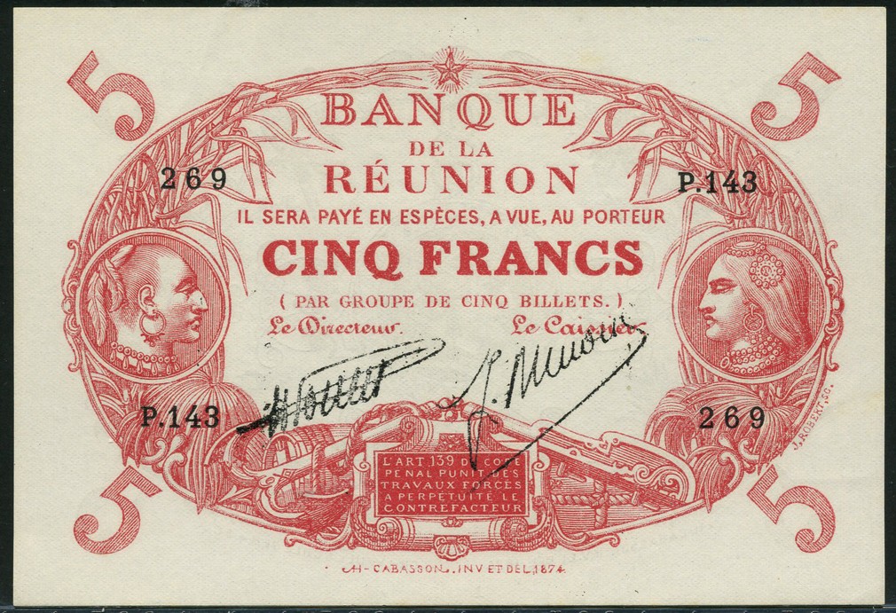 Banque de la Reunion, 5 francs, 'Cabasson', ND (1938), serial number P.143 269, red and white, indigenous native head at left and right, Poulet and Ninon signatures, reverse black and white, native head at centre, parrots and foliage, value at each corner