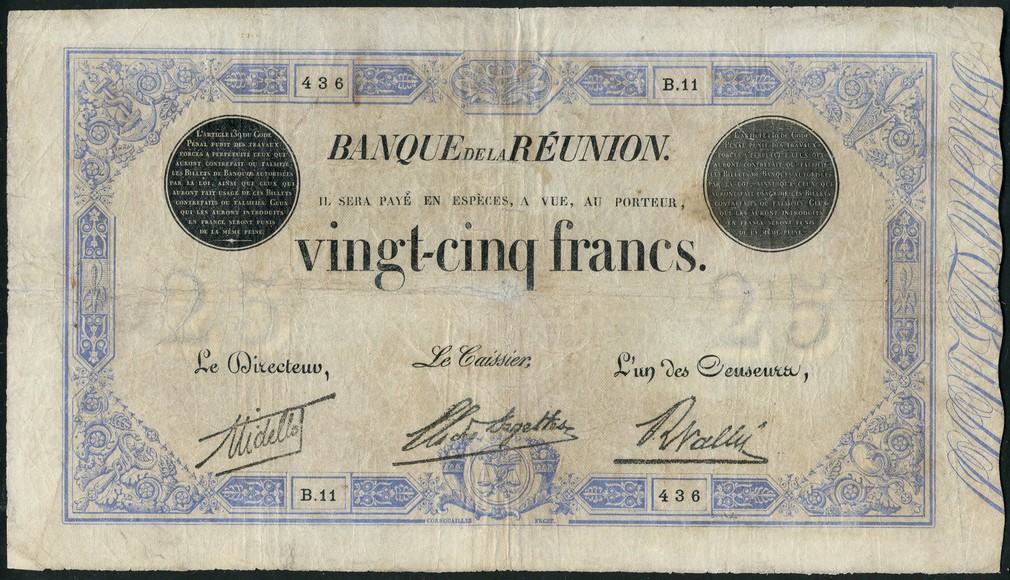 Banque de la Reunion, 25 francs, ND (1929-), serial number B.11 436, blue and white, black seal top left and right, handstamped signatures of Didelot, des Sagettes and Vally, reverse purple-brown and white, galley low centre, floral border around