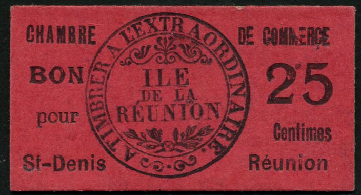 Chambre de Commerce, Reunion, 25 centimes, Saint Denis, ND (type of 1918), black text on red thick card, circular handstamp at centre, reverse handstamped signature of Le President, Georges Jaquier