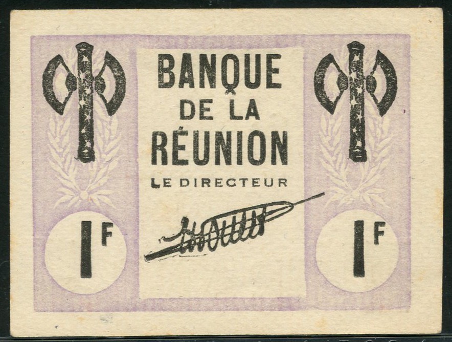 Banque de la Reunion, 1 franc, 'Francisque', 8 October 1942, mauve, and white, black text, Francisque (Vichy axe) at top left and right, value low left and right, signature of H.Poulet low centre, reverse mauve and white, coastline in background, value in field and at each corner, reverse