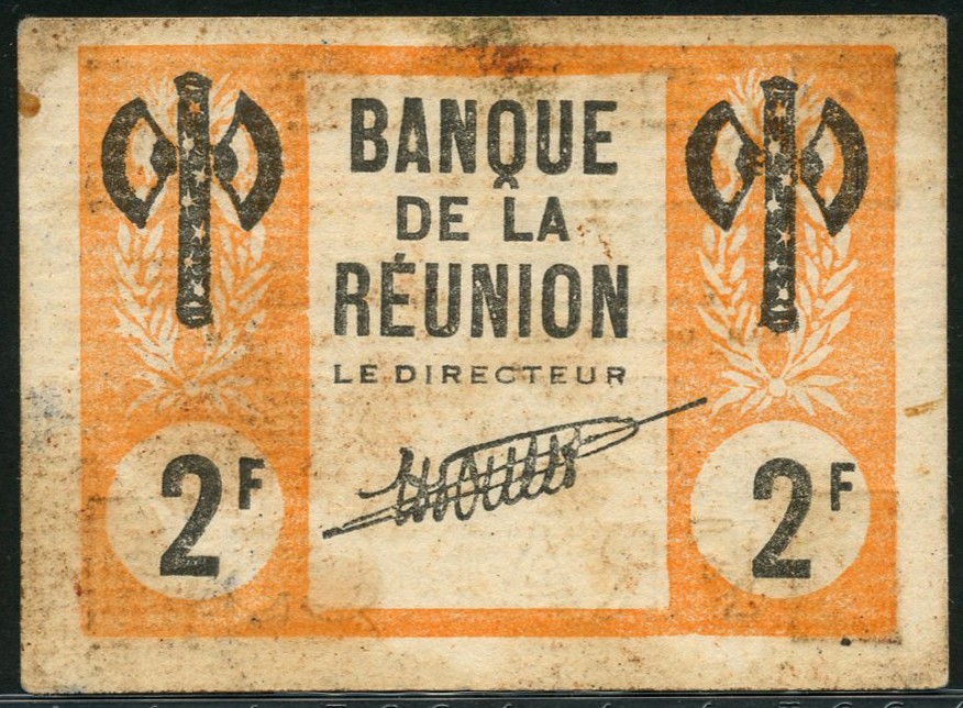 Banque de la Reunion, 2 francs, 'Francisque', 8 October 1942, orange and white, black text, Francisque (Vichy axe) at top left and right, value low left and right, signature of H.Poulet low centre, reverse orange and white, coastline in background, value in field and at each corner, reverse