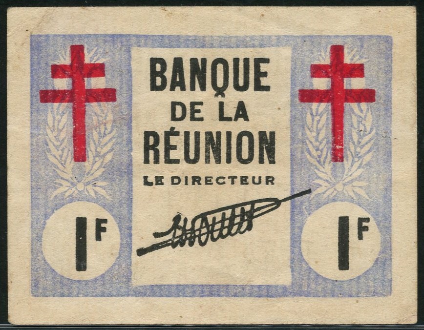 Banque de la Reunion, 1 franc, 'Croix de Lorraine', 12 August 1943, pale blue, and white, black text, red Cross of Lorraine at top left and right, value low left and right, signature of H.Poulet low centre, reverse pale blue and white, coastline in background, value in field and at each corner, reverse