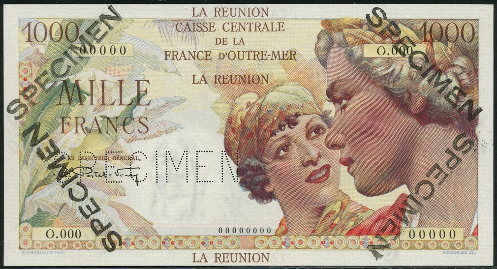 Caisse Centrale de la France d'Outre-Mer, Reunion, specimen 1000 francs, 'Union Francaise', ND (1946), zero serial numbers, red and multicoloured, two women at right (France and a Martinican girl), foliage at left, Postel-Vinay signature, LA REUNION in borders, reverse multicoloured, woman at right, locals in canoe at left, coastline