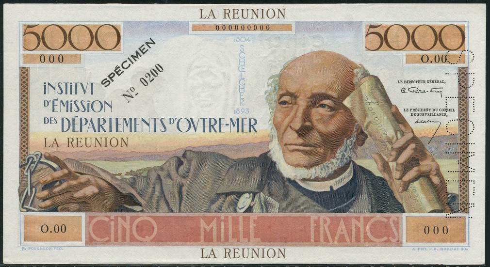 Institut d'Emission des Departements d'Outre-Mer, Reunion, specimen 5000 francs, 'Schoelcher', ND (1960), zero serial numbers, pink-red and multicoloured, Victor Schoelcher at right, Postel-Vinay and Calvet signatures, LA REUNION in borders, reverse multicoloured, local market scene