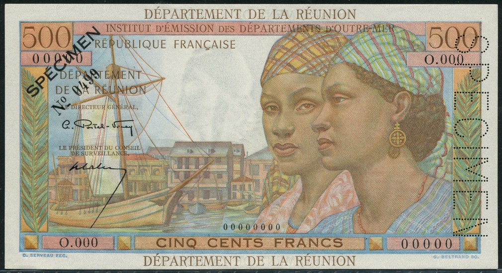 Institut d'Emission des Departements d'Outre-Mer, Reunion, specimen 500 francs, 'Pointe a Pitre', ND (1964), zero serial numbers, blue and multicoloured, two women at right, boat and quayside at left centre, Postel-Vinay and Calvet signatures, DEPARTEMENT DE LA REUNION in borders, reverse multicoloured, two bullock carts and harvesting scene