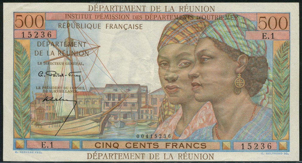 Institut d'Emission des Departements d'Outre-Mer, Reunion, 500 francs, 'Pointe a Pitre', ND (1964), serial number E.1 15236, blue and multicoloured, two women at right, boat and quayside at left centre, Postel-Vinay and Calvet signatures, DEPARTEMENT DE LA REUNION in borders, reverse multicoloured, two bullock carts and harvesting scene