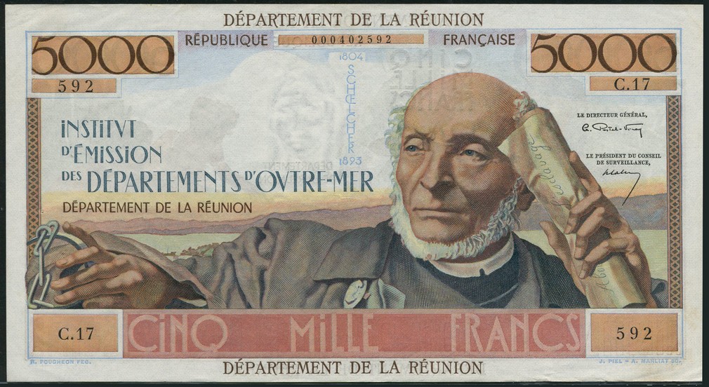 Institut d'Emission des Departements d'Outre-Mer, Reunion, 5000 francs, 'Schoelcher', ND (1964), serial number C.17 592, pink-red and multicoloured, Victor Schoelcher at right, Postel-Vinay and Calvet signatures, DEPARTEMENT DE LA REUNION in borders, reverse multicoloured, local market scene