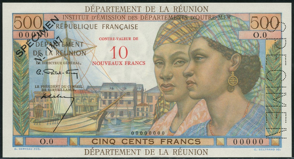 Institut d'Emission des Departements d'Outre-Mer, Reunion, specimen 10NF on 500 francs, 'Pointe a Pitre', ND (1973), zero serial numbers, blue and multicoloured, two women at right, boat and quayside at left centre, Postel-Vinay and Calvet signatures, DEPARTEMENT DE LA REUNION in borders, red CONTRE-VALEUR DE 10 NOUVEAUX FRANCS top centre, reverse multicoloured, two bullock carts and harvesting scene