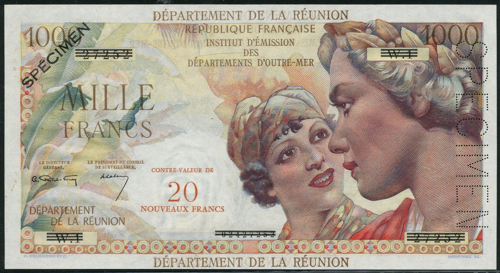 Institut d'Emission des Departements d'Outre-Mer, Reunion, specimen 20NF on 1000 francs, 'Union Francaise', ND (1973), serial number W.1 27252 (line cancelled), red and multicoloured, two women at right (France and a Martinican girl), foliage at left, Postel-Vinay and Calvet signatures, DEPARTEMENT DE LA REUNION in borders, red overprint CONTRE-VALEUR DE 20 NOUVEAUX FRANCS low left centre, reverse multicoloured, woman at right, locals in canoe at left, coastline