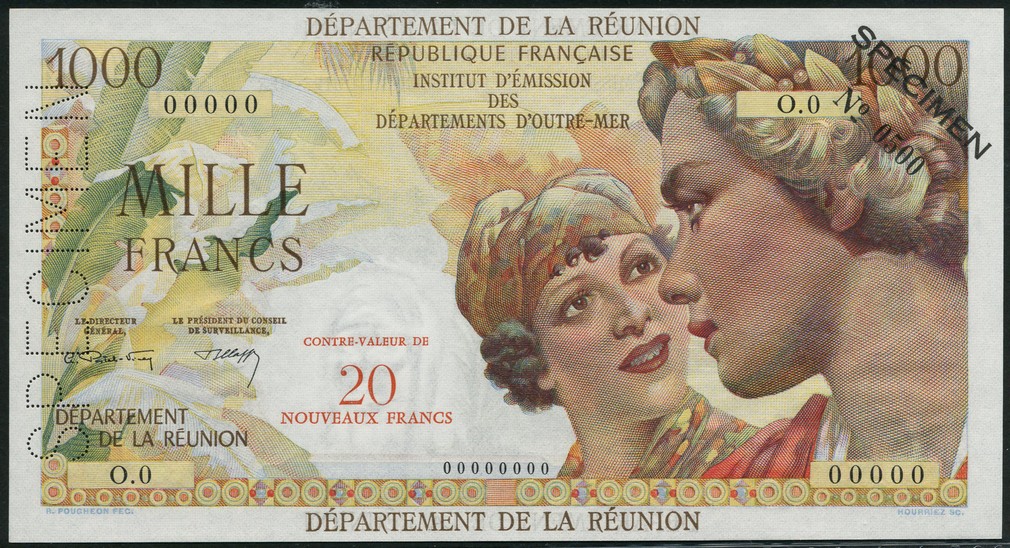Institut d'Emission des Departements d'Outre-Mer, Reunion, specimen 20NF on 1000 francs, 'Union Francaise', ND (1973), zero serial numbers, red and multicoloured, two women at right (France and a Martinican girl), foliage at left, Postel-Vinay and Clappier signatures, DEPARTEMENT DE LA REUNION in borders, red overprint CONTRE-VALEUR DE 20 NOUVEAUX FRANCS low centre, reverse multicoloured, woman at right, locals in canoe at left, coastline