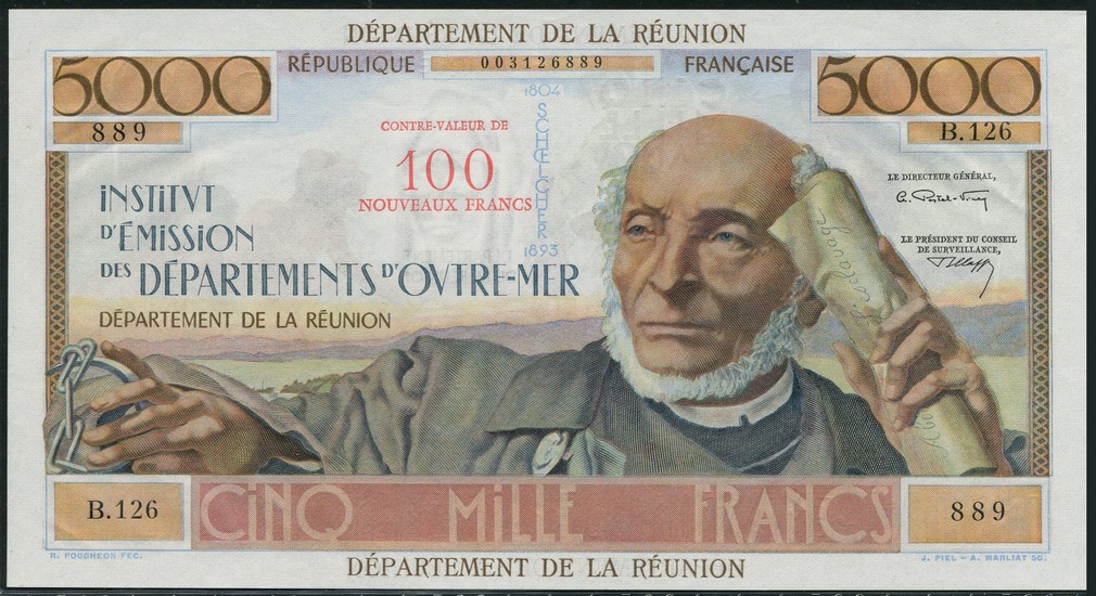 Institut d'Emission des Departements d'Outre-Mer, Reunion, 100NF on 5000 francs, 'Schoelcher', ND (1967), serial number B.126 889, pink-red and multicoloured, Victor Schoelcher at right, Postel-Vinay and Clappier signatures, DEPARTEMENT DE LA REUNION in borders, red overprint CONTRE-VALEUR DE 100 NOUVEAUX FRANCS, reverse multicoloured, local market scene