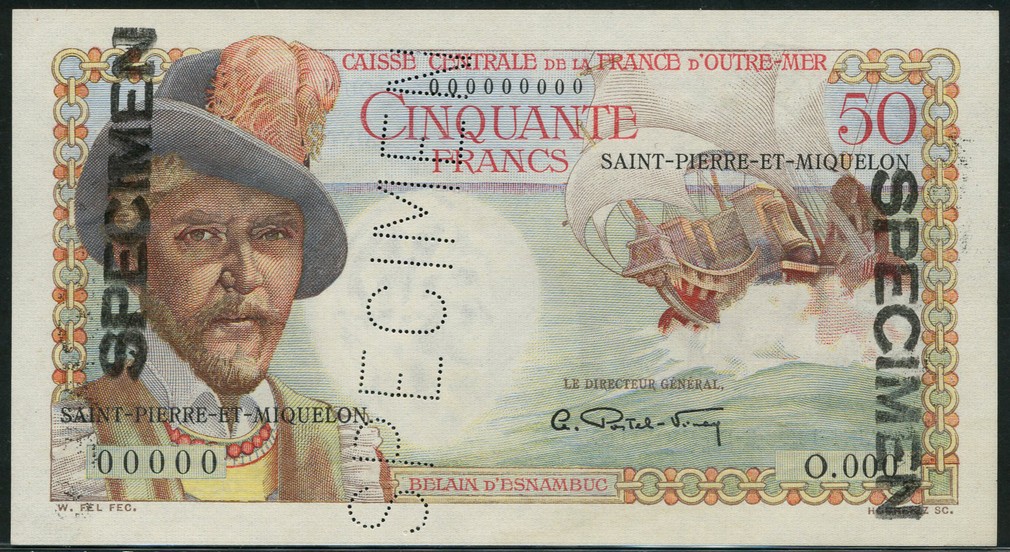 Caisse Centrale de la France d'Outre-Mer, Saint Pierre et Miquelon, specimen 5 francs, 'Bougainville', 10 francs, 'Colbert', 20 francs, 'Emile Gentil' and 50 francs, 'D'Esnambuc', all ND (1950), all zero serial numbers and Postel-Vinay signature
