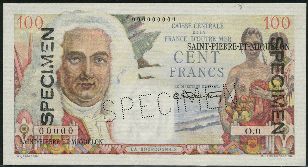 Caisse Centrale de la France d'Outre-Mer, Saint Pierre et Miquelon, specimen 100 francs, 'La Bourdonnais', ND (1946), zero serial numbers, red and multicoloured, La Bourdonnais at left, local couple at right, Postel-Vinay signature, reverse red and multicoloured, girl at right, mountain at left