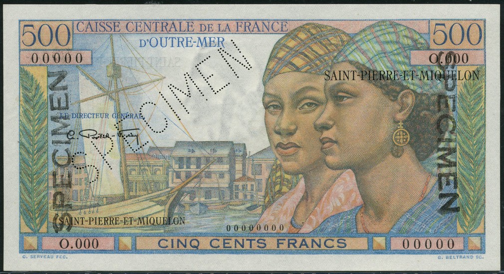 Caisse Centrale de la France d'Outre-Mer, Saint Pierre et Miquelon, specimen 500 francs, 'Point a Pitre', ND (1946), zero serial numbers, blue and multicoloured, two women at right, boat and quayside at left, Postel-Vinay signature, reverse blue and multicoloured, bullock carts and harvesting scene