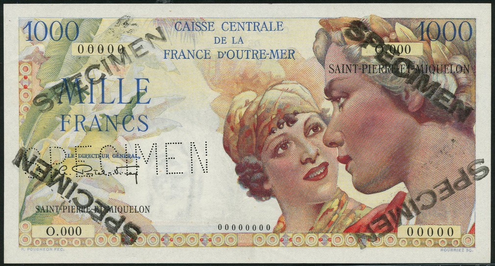 Caisse Centrale de la France d'Outre-Mer, Saint Pierre et Miquelon, specimen 1000 francs, 'Union Francaise', ND (1946), zero serial numbers, red and multicoloured, two women at right (France and a Matinican girl), foliage in background, Postel-Vinay signature, reverse multicoloured, coastline, locals in canoe and woman in head dress at right