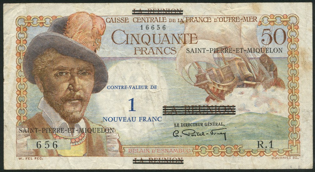 Caisse Centrale de la France d'Outre-Mer, Saint Pierre and Miquelon, 1 NF on 50 francs, 'D'Esnambuc', ND (1960), serial number R.1 656, multicoloured, D'Esnambuc at left, galleon at right, LA REUNION cross cancelled in brown, Postel-Vinay signature, five digit control number, blue 'CONTRE-VALEUR DE 1 NOUVEAU FRANC' at left centre, reverse multicoloured, girl at left
