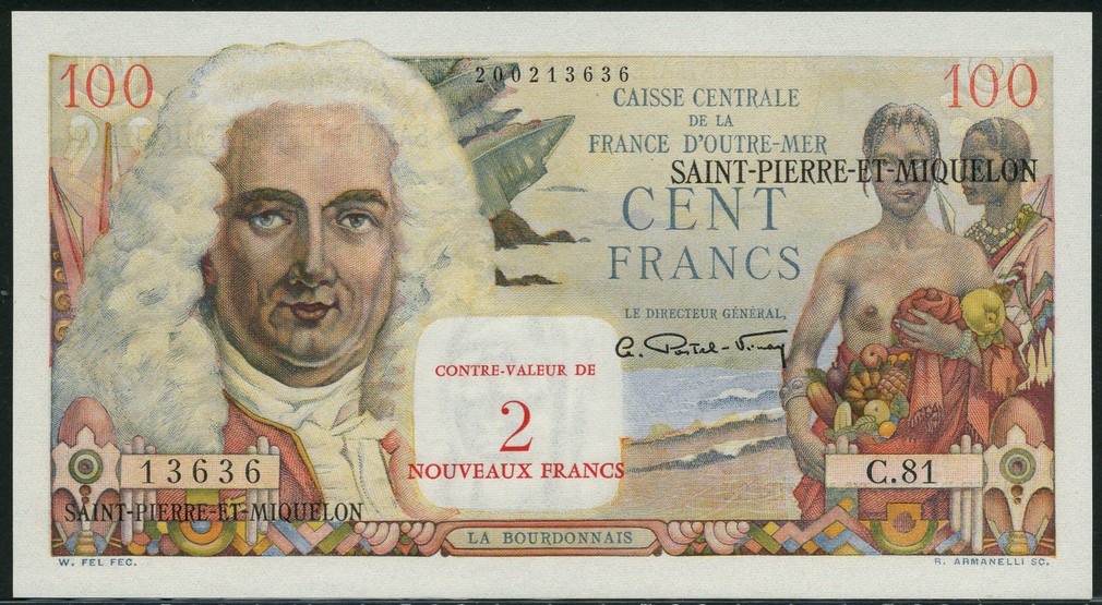 Caisse Centrale de la France d'Outre-Mer, Saint Pierre and Miquelon, 2 NF on 100 francs, 'La Bourdonnais', ND (1960), serial number C.81-13636, red and multicoloured, La Bourdonnais at left, local girls with fruit at right, Postel Vinay signature, red 'CONTRE-VALEUR DE 2 NOUVEAUX FRANCS' at left centre, reverse multicoloured, girl at right, mountain at right