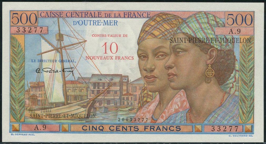 Caisse Centrale de la France d'Outre-Mer, Saint Pierre et Miquelon, 10NF on 500 francs, 'Point a Pitre', ND (1960), serial number A.9 33277, blue and multicoloured, two women at right, boat and quayside at left, Postel-Vinay signature, red overprint 'CONTRE-VALEUR DE 10NOUVEAUX FRANCS' top centre, reverse blue and multicoloured, bullock carts and harvesting scene