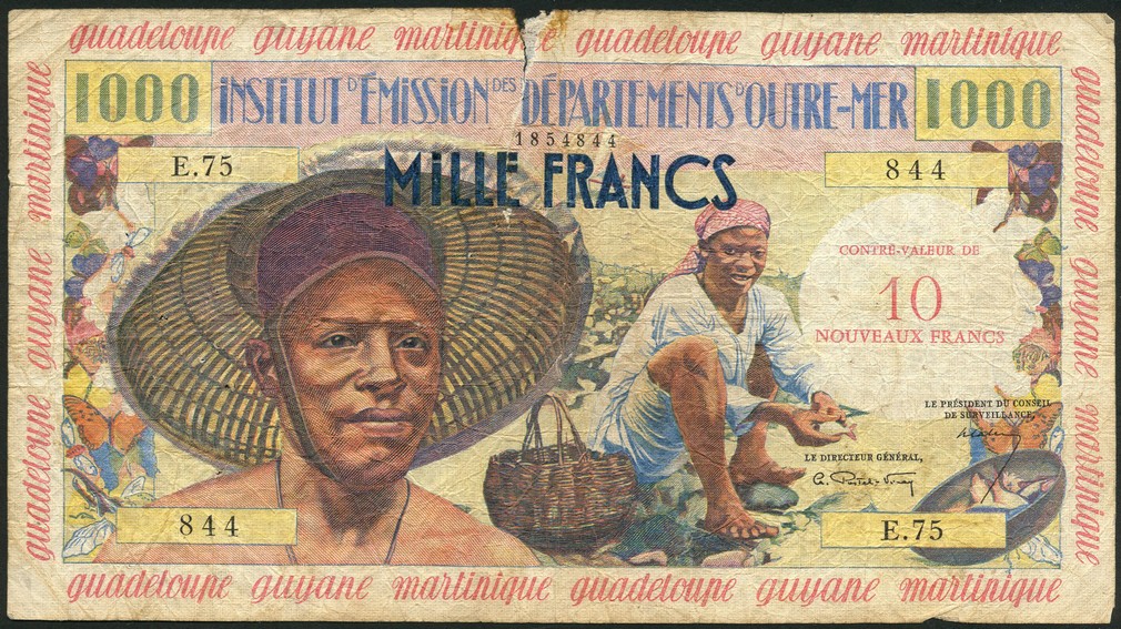 Institut d'Emission des Departements d'Outre-Mer, French Antilles, 10 NF on 1000 francs, 'Pecheur', ND (1960-), serial number E.75 844, blue and multicoloured, fishermen, Postel-Vinay and Calvet signatures, red 'CONTRE-VALEUR DE 10 NOUVEAUX FRANCS' at centre, MARTINIQUE/GUADELOUPE/GUYANE in red in borders around, reverse multicoloured, woman with basket of fruit, banana tree at right